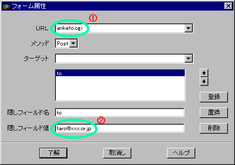 (3) 属性変更ダイアログを開き(Ctrl+Aで開く)、URL欄に、"anketo.cgi"と表示されますので、